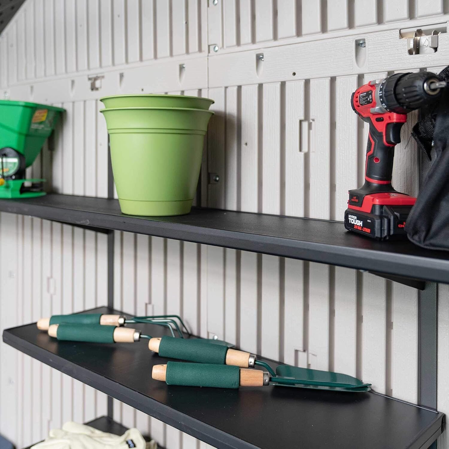Generous interior dimensions of 174” L × 90” W × 70–94” H offer ample room for large garden tools, lawn equipment, bicycles, and seasonal items.