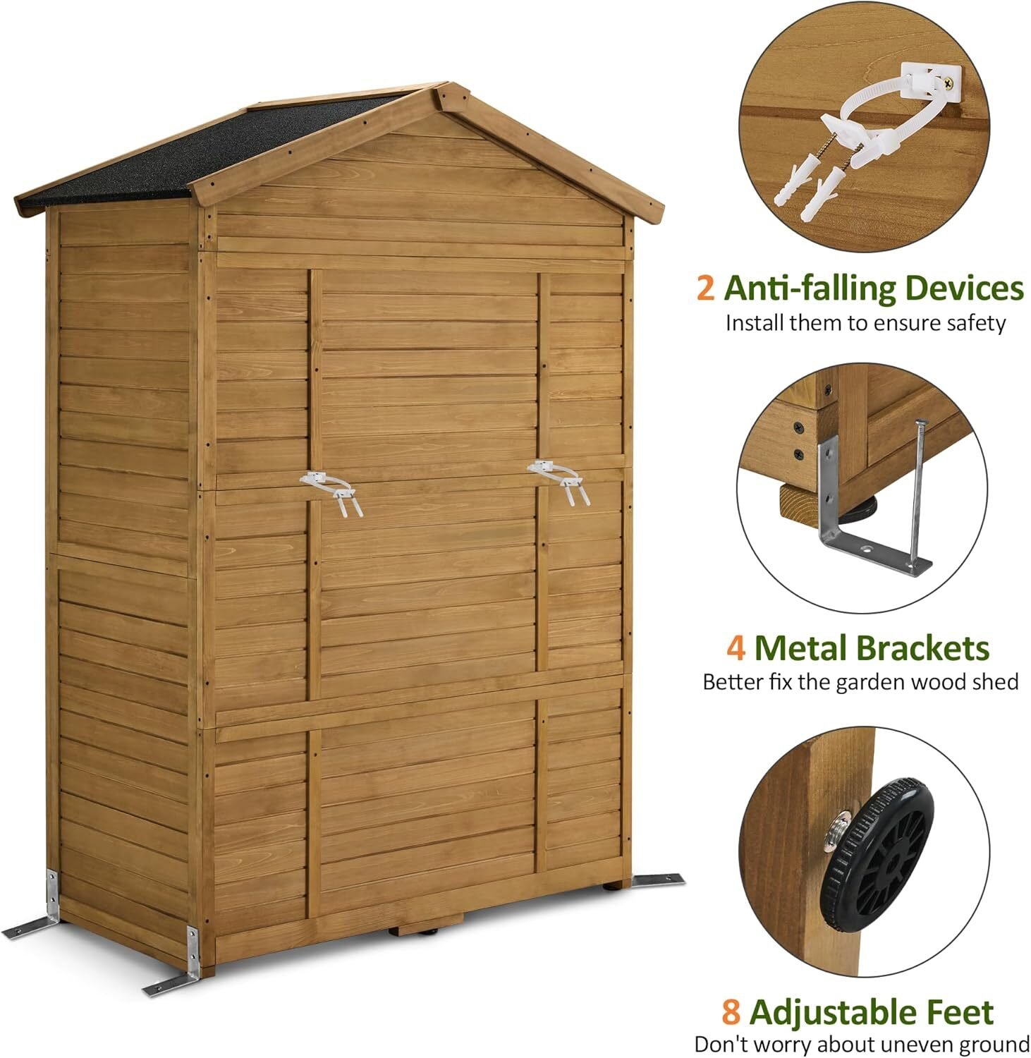 Equipped with four reinforced metal ground brackets and two anti-tip safety devices. The brackets help fix the shed to the ground for extra stability, while the wall-mounting kits prevent tipping.