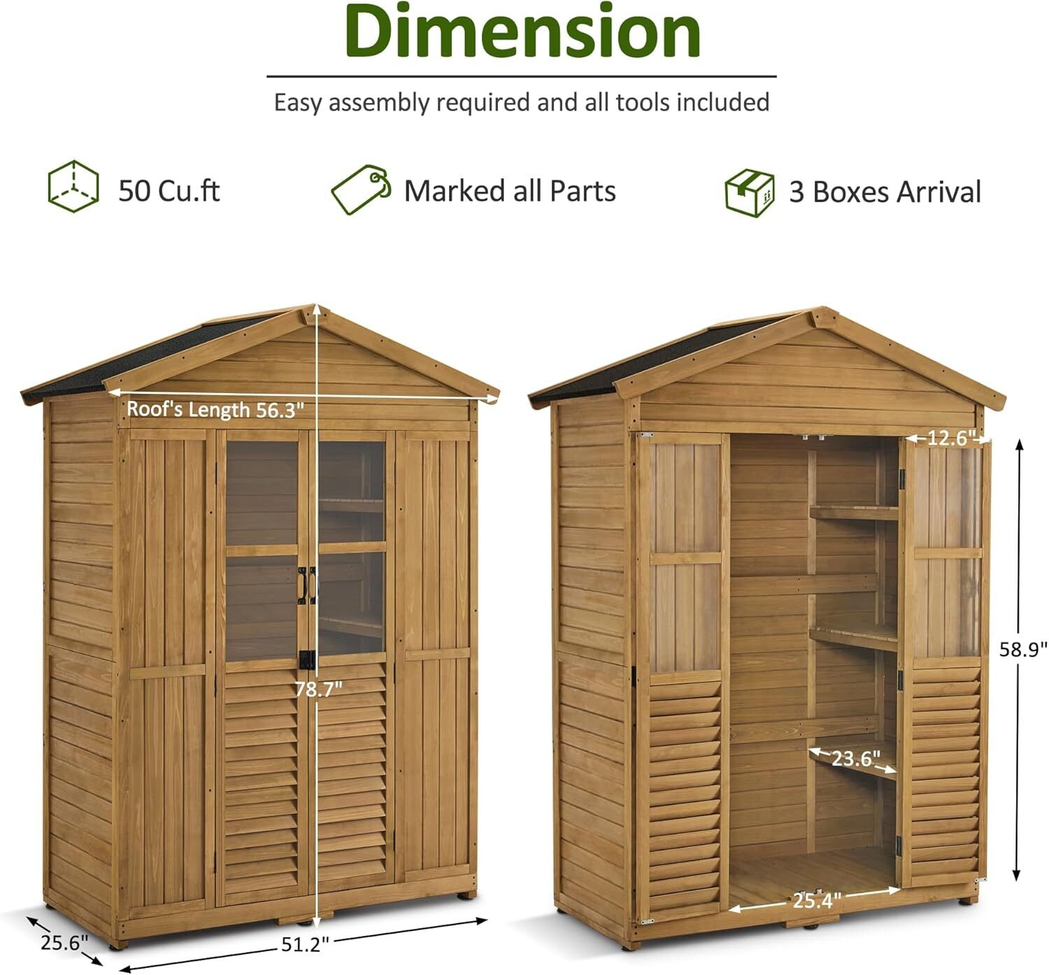 The sloped roof is covered with asphalt for effective water resistance. It allows rain and snow to slide off easily, preventing water accumulation and extending the life of the shed.